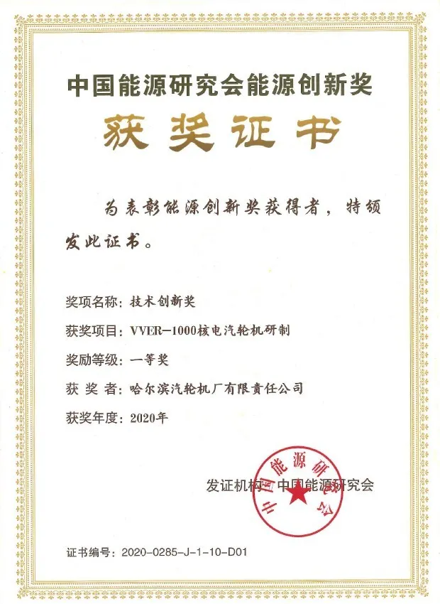 日前,哈电汽轮机“VVER-1000核电汽轮机研制”项目荣获中国能源研究会技术创新奖一等奖。