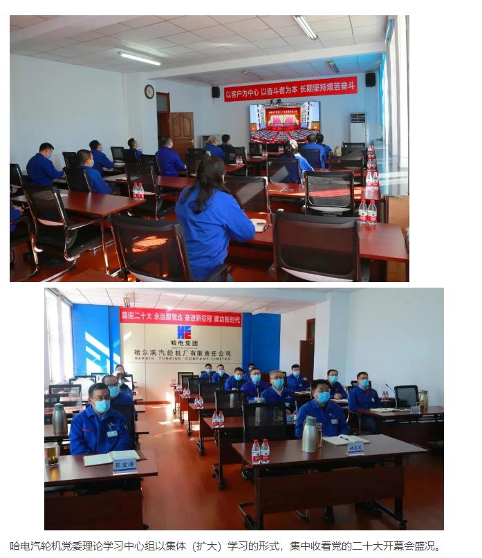 哈电汽轮机党委组织广大党员干部员工认真收听收看大会开幕会直播盛况,认真聆听习近平总书记所作的报告。哈电汽轮机党委理论学习中心组以集体(扩大)学习的形式,集中收看党的二十大开幕会盛况。哈电汽轮机各直属党组织分别组织中层干部和党员骨干集中观看党的二十大开幕会。公司广大党员、员工按照公司党委部署要求,通过电视、网络、广播等多种方式收听收看开幕会直播。